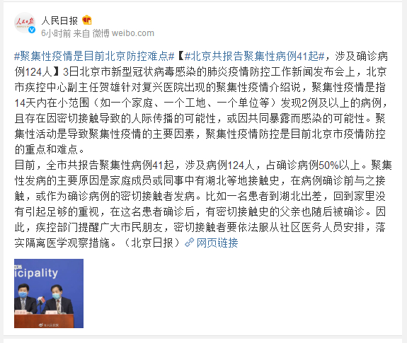 3日北京市新型冠状病毒感染的肺炎疫情防控工作新闻发布会上,北京市疾控中心副主任贺雄针对复兴医院出现的聚集性疫情介绍说,聚集性疫情是指14天内在小范围(如一个家庭、一个工地、一个单位等)发现2例及以上的病例,且存在因密切接触导致的人际传播的可能性,或因共同暴露而感染的可能性。聚集性活动是导致聚集性疫情的主要因素,聚集性疫情防控是目前北京市疫情防控的重点和难点。