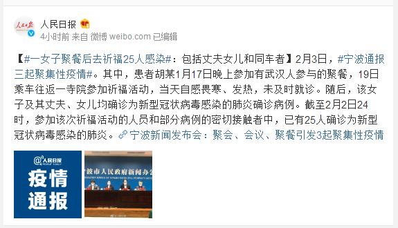 2月3日,#宁波通报三起聚集性疫情#。其中,患者胡某1月17日晚上参加有武汉人参与的聚餐,19日乘车往返一寺院参加祈福活动,当天自感畏寒、发热,未及时就诊。随后,该女子及其丈夫、女儿均确诊为新型冠状病毒感染的肺炎确诊病例。截至2月2日24时,参加该次祈福活动的人员和部分病例的密切接触者中,已有25人确诊为新型冠状病毒感染的肺炎。