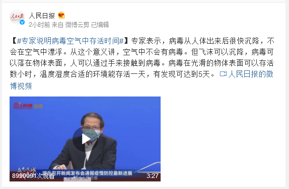 专家表示,病毒从人体出来后很快沉降,不会在空气中漂浮。从这个意义讲,空气中不会有病毒。但飞沫可以沉降,病毒可以落在物体表面,人可以通过手来接触到病毒。病毒在光滑的物体表面可以存活数小时,温度湿度合适的环境能存活一天,有发现可达到5天。