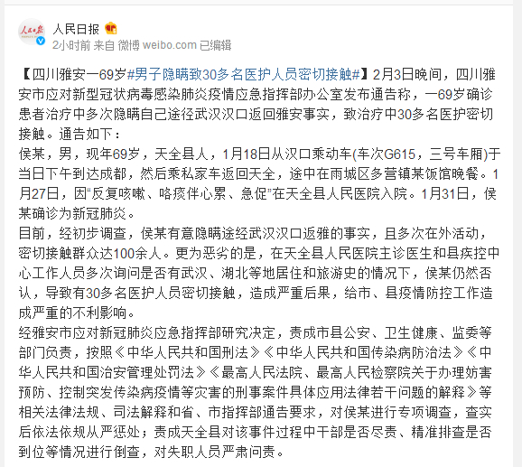 目前,经初步调查,侯某有意隐瞒途经武汉汉口返雅的事实,且多次在外活动,密切接触群众达100余人。更为恶劣的是,在天全县人民医院主诊医生和县疾控中心工作人员多次询问是否有武汉、湖北等地居住和旅游史的情况下,侯某仍然否认,导致有30多名医护人员密切接触,造成严重后果,给市、县疫情防控工作造成严重的不利影响。