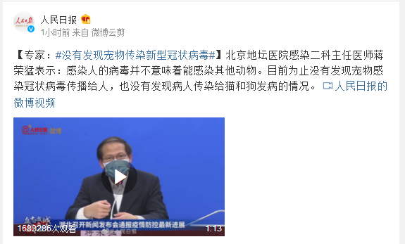 北京地坛医院感染二科主任医师蒋荣猛表示:感染人的病毒并不意味着能感染其他动物。目前为止没有发现宠物感染冠状病毒传播给人,也没有发现病人传染给猫和狗发病的情况。