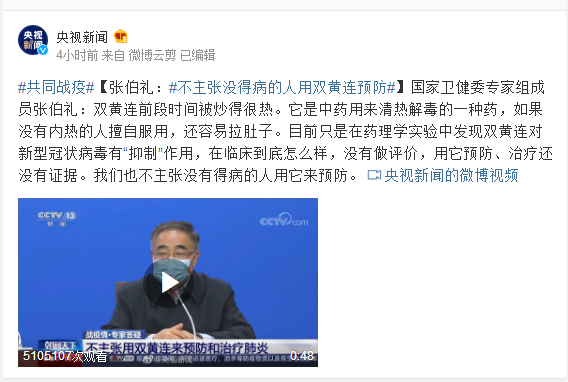 国家卫健委专家组成员张伯礼:双黄连前段时间被炒得很热。它是中药用来清热解毒的一种药,如果没有内热的人擅自服用,还容易拉肚子。目前只是在药理学实验中发现双黄连对新型冠状病毒有“抑制”作用,在临床到底怎么样,没有做评价,用它预防、治疗还没有证据。我们也不主张没有得病的人用它来预防。