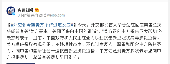 今天,外交部发言人华春莹在回应美国总统特朗普有关“美方基本上关闭了来自中国的通道”、“美方正向中方提供巨大帮助”的表态时表示:当前,中国政府和人民正在全力以赴抗击新型冠状病毒肺炎疫情。美方理应采取客观公正、冷静理性态度,不作过度反应,尊重和配合中方防控努力,同中国和国际社会一道抗击新冠肺炎疫情。中方注意到美方多次表示愿向中方提供援助,希望有关援助早日到位。