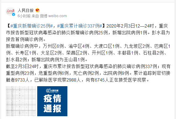截至2月3日24时,重庆市累计报告新型冠状病毒感染的肺炎确诊病例337例;现有重型病例23例,危重型病例6例,死亡病例2例,出院病例9例。累计追踪到密切接触者9733人,已解除医学观察2988人,尚有6745人正在接受医学观察。