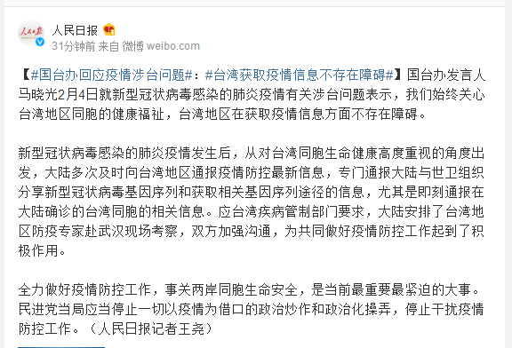 国台办发言人马晓光2月4日就新型冠状病毒感染的肺炎疫情有关涉台问题表示,我们始终关心台湾地区同胞的健康福祉,台湾地区在获取疫情信息方面不存在障碍。