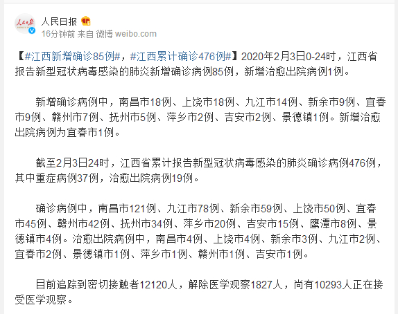 截至2月3日24时,江西省累计报告新型冠状病毒感染的肺炎确诊病例476例,其中重症病例37例,治愈出院病例19例。