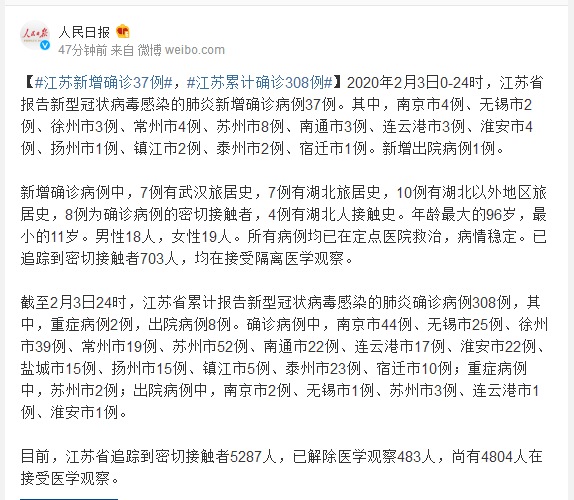 目前,江苏省追踪到密切接触者5287人,已解除医学观察483人,尚有4804人在接受医学观察。