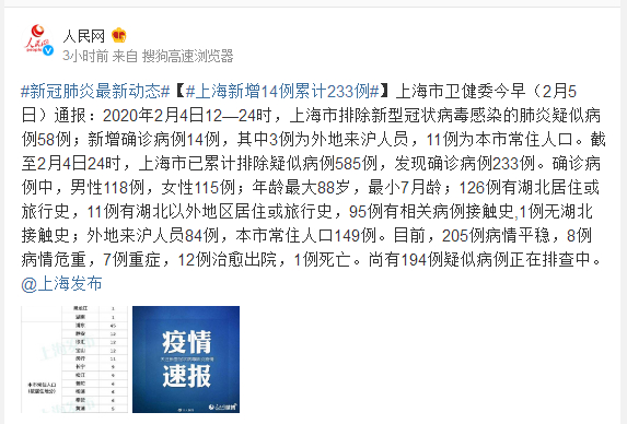 上海市卫健委今早(2月5日)通报:2020年2月4日12—24时,上海市排除新型冠状病毒感染的肺炎疑似病例58例;新增确诊病例14例,其中3例为外地来沪人员,11例为本市常住人口。截至2月4日24时,上海市已累计排除疑似病例585例,发现确诊病例233例。确诊病例中,男性118例,女性115例;年龄最大88岁,最小7月龄;126例有湖北居住或旅行史,11例有湖北以外地区居住或旅行史,95例有相关病例接触史,1例无湖北接触史;外地来沪人员84例,本市常住人口149例。目前,205例病情平稳,8例病情危重,7例重症,12例治愈出院,1例死亡。尚有194例疑似病例正在排查中。