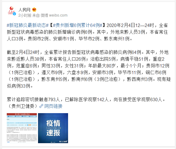截至2月4日24时,全省累计报告新型冠状病毒感染的肺炎病例64例。其中,外地来黔返黔人员38例,本省常住人口26例;治愈出院5例,病情平稳51例,重症2例,危重症6例;男性33例,女性31例;年龄最大80岁,最小1个月;贵阳市12例(1例已治愈),遵义市9例,六盘水9例,安顺市3例,毕节市11例,铜仁市6例(1例已治愈),黔东南州5例,黔南州6例(3例已治愈),黔西南州3例。现有疑似病例33例。