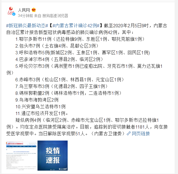 截至2020年2月5日9时,内蒙古自治区累计报告新型冠状病毒感染的肺炎确诊病例42例,其中: