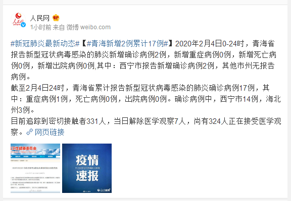 截至2月4日24时,青海省累计报告新型冠状病毒感染的肺炎确诊病例17例,其中:重症病例1例,死亡病例0例,出院病例0例。确诊病例中,西宁市14例,海北州3例。