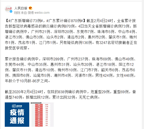 截至2月4日24时,全省累计报告新型冠状病毒感染的肺炎确诊病例870例。4日当天全省新增确诊病例73例,新增确诊病例中,广州市21例、深圳市20例、东莞市7例、珠海市5例、中山市4例、湛江市3例、佛山市3例、汕头市2例、清远市2例、惠州市2例、肇庆市1例、梅州市1例、茂名市1例、江门市1例。另有疑似病例136例。有3247名密切接触者正在接受医学观察。