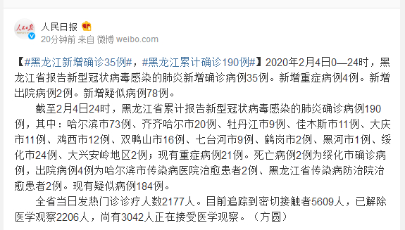 2020年2月4日0—24时,黑龙江省报告新型冠状病毒感染的肺炎新增确诊病例35例。新增重症病例4例。新增出院病例2例。新增疑似病例78例。
