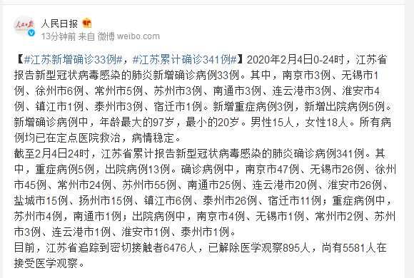 截至2月4日24时,江苏省累计报告新型冠状病毒感染的肺炎确诊病例341例。其中,重症病例5例,出院病例13例。确诊病例中,南京市47例、无锡市26例、徐州市45例、常州市24例、苏州市55例、南通市25例、连云港市20例、淮安市26例、盐城市15例、扬州市15例、镇江市6例、泰州市26例、宿迁市11例;重症病例中,苏州市4例,南通市1例;出院病例中,南京市4例、无锡市1例、常州市2例、苏州市3例、连云港市1例、淮安市1例、泰州市1例。