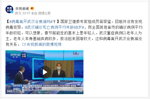 国家卫健委专家组成员蒋荣猛:目前并没有发现病毒变异。#武汉确诊死亡病例平均年龄68岁#,而全国其他省市的确诊病例平均年龄较轻。可以想象,春节前能走的基本上是年轻人。武汉重症病例以老年人为主,老年人本身基础疾病较多,救治起来困难较大。这和病毒离开武汉会衰减没有关系。
