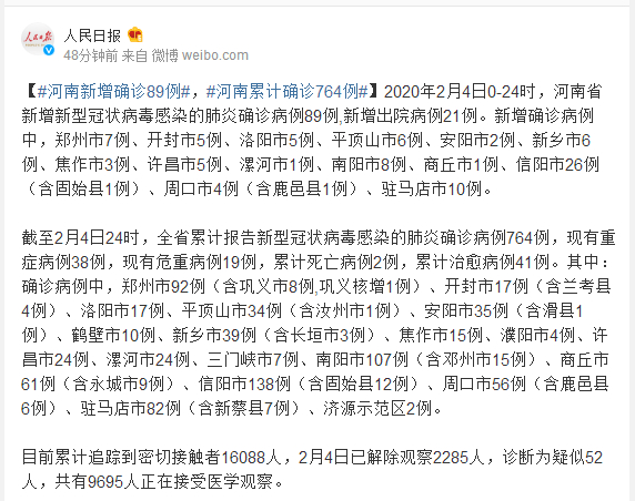 截至2月4日24时,全省累计报告新型冠状病毒感染的肺炎确诊病例764例,现有重症病例38例,现有危重病例19例,累计死亡病例2例,累计治愈病例41例。其中:确诊病例中,郑州市92例(含巩义市8例,巩义核增1例)、开封市17例(含兰考县4例)、洛阳市17例、平顶山市34例(含汝州市1例)、安阳市35例(含滑县1例)、鹤壁市10例、新乡市39例(含长垣市3例)、焦作市15例、濮阳市4例、许昌市24例、漯河市24例、三门峡市7例、南阳市107例(含邓州市15例)、商丘市61例(含永城市9例)、信阳市138例(含固始县12例)、周口市56例(含鹿邑县6例)、驻马店市82例(含新蔡县7例)、济源示范区2例。