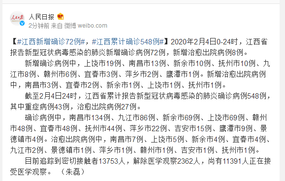 截至2月4日24时,江西省累计报告新型冠状病毒感染的肺炎确诊病例548例,其中重症病例43例,治愈出院病例27例。