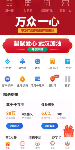 一方有难,八方支援。早在1月26日,苏宁金融就紧急上线“抗击新型肺炎疫情”公益项目,为大众提供便捷捐款通道。登陆“苏宁金融APP”,点击首页banner图,即可一键开启线上捐赠,为疫情防控贡献一份爱心、一份力量,为武汉加油。