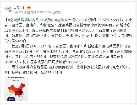 截至2月5日24时,31个省(自治区、直辖市)和新疆生产建设兵团累计报告确诊病例28018例,累计治愈出院1153例,隔离治疗26302例(其中重症病例3859例),累计死亡病例563例,现有疑似病例24702例。累计追踪到密切接触者282813人,尚在医学观察的密切接触者186354人。
