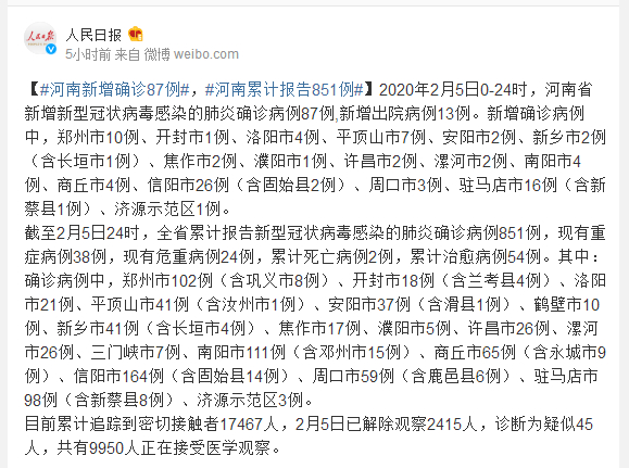 截至2月5日24时,全省累计报告新型冠状病毒感染的肺炎确诊病例851例,现有重症病例38例,现有危重病例24例,累计死亡病例2例,累计治愈病例54例。其中:确诊病例中,郑州市102例(含巩义市8例)、开封市18例(含兰考县4例)、洛阳市21例、平顶山市41例(含汝州市1例)、安阳市37例(含滑县1例)、鹤壁市10例、新乡市41例(含长垣市4例)、焦作市17例、濮阳市5例、许昌市26例、漯河市26例、三门峡市7例、南阳市111例(含邓州市15例)、商丘市65例(含永城市9例)、信阳市164例(含固始县14例)、周口市59例(含鹿邑县6例)、驻马店市98例(含新蔡县8例)、济源示范区3例。