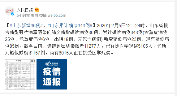 2020年2月5日12—24时,山东省报告新型冠状病毒感染的肺炎新增确诊病例36例,累计确诊病例343例(含重症病例25例,危重症病例6例,出院18例,无死亡病例);新增疑似病例23例,现有疑似病例85例。截至目前,追踪到密切接触者11277人,已解除医学观察5105人,诊断为疑似或确诊157例,尚有6015人正在接受医学观察。