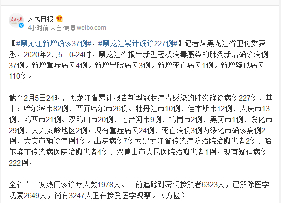 记者从黑龙江省卫健委获悉,2020年2月5日0-24时,黑龙江省报告新型冠状病毒感染的肺灸新增确诊病例37例。新增重症病例4例。新增岀院病例3例。新增死亡病例1例。新增疑似病例110例。