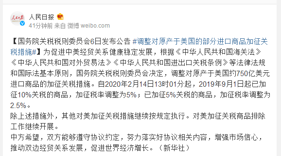 为促进中美经贸关系健康稳定发展,根据《中华人民共和国海关法》《中华人民共和国对外贸易法》《中华人民共和国进出口关税条例》等法律法规和国际法基本原则,国务院关税税则委员会决定,调整对原产于美国约750亿美元进口商品的加征关税措施。自2020年2月14日13时01分起,2019年9月1日起已加征10%关税的商品,加征税率调整为5%;已加征5%关税的商品,加征税率调整为2.5%。