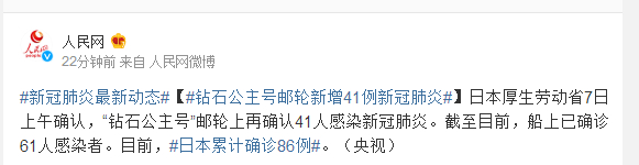 日本厚生劳动省7日上午确认,“钻石公主号”邮轮上再确认41人感染新冠肺炎。截至目前,船上已确诊61人感染者。目前,#日本累计确诊86例#。(央视)