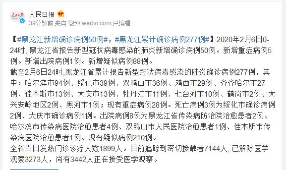 2020年2月6日0-24时, 黑龙江省报告新型冠状病毒感染的肺炎新增确诊病例50例。新增重症病例5例。新增出院病例1例。新增疑似病例88例。