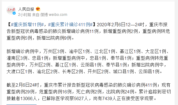 截至2月6日24时,重庆市累计报告新型冠状病毒感染的肺炎确诊病例411例;现有重型病例29例,危重型病例16例,死亡病例2例,出院病例24例。累计追踪到密切接触者13066人,已解除医学观察5627人,尚有7439人正在接受医学观察。