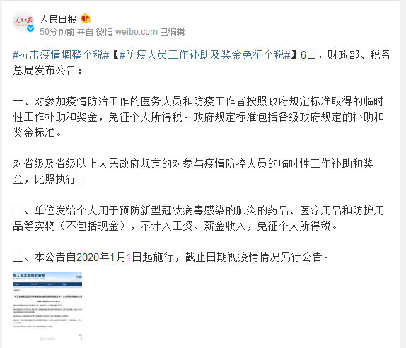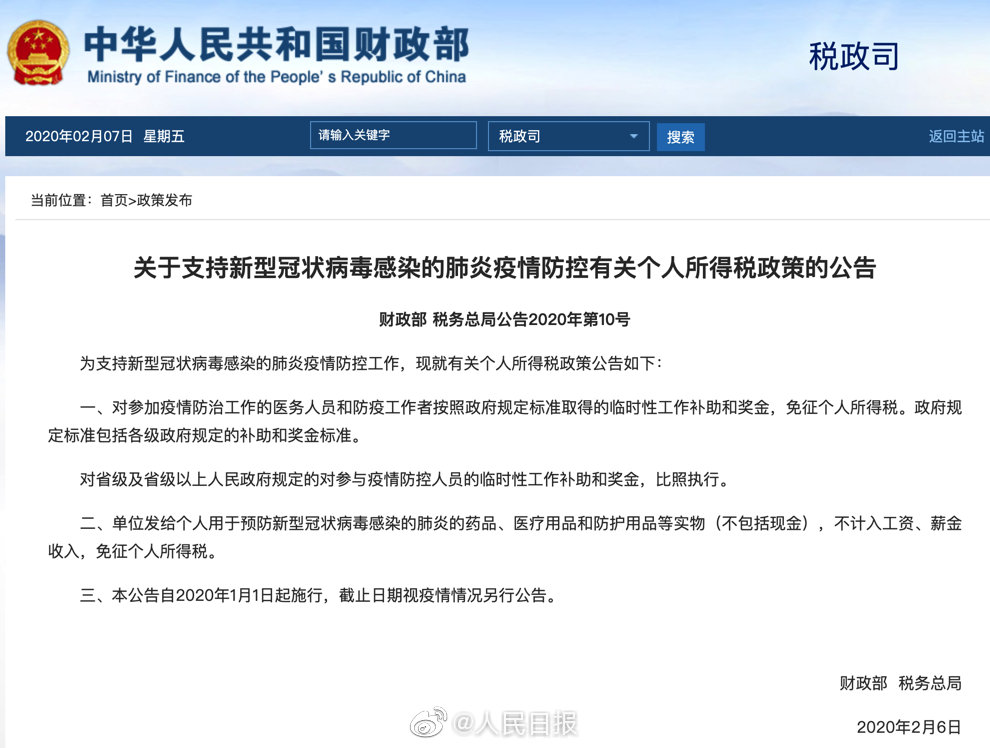 一、对参加疫情防治工作的医务人员和防疫工作者按照政府规定标准取得的临时性工作补助和奖金,免征个人所得税。政府规定标准包括各级政府规定的补助和奖金标准。