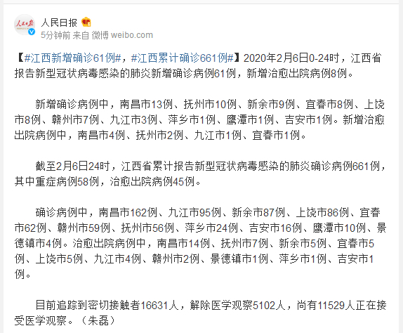 截至2月6日24时,江西省累计报告新型冠状病毒感染的肺炎确诊病例661例,其中重症病例58例,治愈出院病例45例。