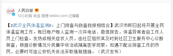 武汉市即日起将开展全民体温监测工作。每日每户每人监测一次并电话、微信报告,体温异常者由工作人员上门检查。发热或相关症状人员,由社区组织其及时到社区卫生服务中心诊断筛查,根据诊断情况分类集中收治或隔离医学观察。如遇不配合排查工作的市民,必要时可由公安机关依法采取强制措施。(武汉发布)