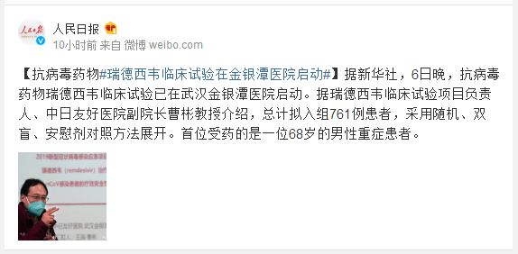 据新华社,6日晚,抗病毒药物瑞德西韦临床试验已在武汉金银潭医院启动。据瑞德西韦临床试验项目负责人、中日友好医院副院长曹彬教授介绍,总计拟入组761例患者,采用随机、双盲、安慰剂对照方法展开。首位受药的是一位68岁的男性重症患者。