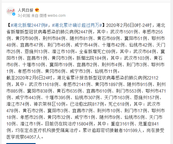 截至2020年2月6日24时,湖北省累计报告新型冠状病毒感染的肺炎病例22112例,其中:武汉市11618例、孝感市2141例、黄冈市1897例、随州市915例、荆州市885例、襄阳市838例、黄石市635例、宜昌市610例、荆门市553例、鄂州市471例、咸宁市443例、十堰市395例、仙桃市307例、天门市163例、恩施州157例、潜江市74例、神农架林区10例。已治愈出院817例。死亡618例,其中:武汉市478例、黄石市2例、襄阳市3例、宜昌市7例、荆州市10例、荆门市17例、鄂州市18例、孝感市25例、黄冈市32例、咸宁市1例、随州市9例、仙桃市5例、天门市10例、潜江市1例。目前仍在院治疗15804例,其中:重症3161例、危重症841例,均在定点医疗机构接受隔离治疗。累计追踪密切接触者101599人,尚在接受医学观察64057人。