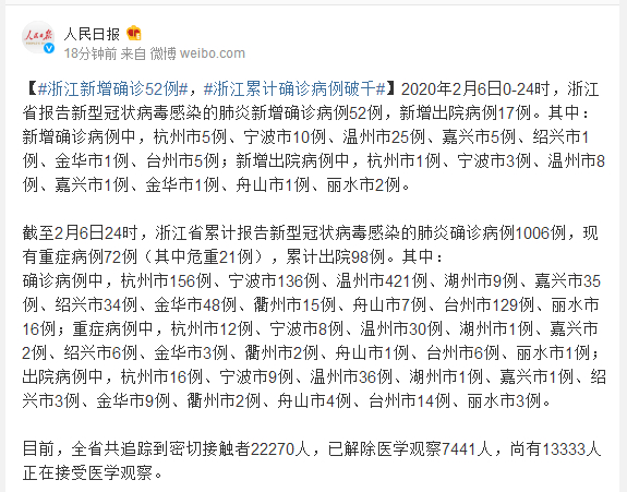 2020年2月6日0-24时,浙江省报告新型冠状病毒感染的肺炎新增确诊病例52例,新增出院病例17例。其中: