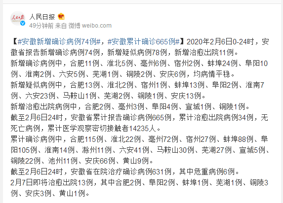 截至2月6日24时,安徽省累计报告确诊病例665例,累计治愈出院病例34例,无死亡病例,累计医学观察密切接触者14235人。