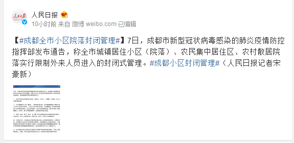 7日,成都市新型冠状病毒感染的肺炎疫情防控指挥部发布通告,称全市城镇居住小区(院落)、农民集中居住区、农村散居院落实行限制外来人员进入的封闭式管理。