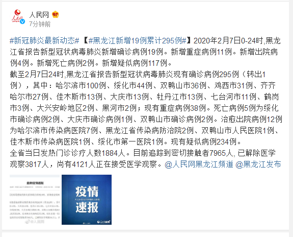 2020年2月7日0-24时,黑龙江省报告新型冠状病毒肺炎新增确诊病例19例。新增重症病例11例。新增出院病例4例。新增死亡病例2例。新增疑似病例117例。
