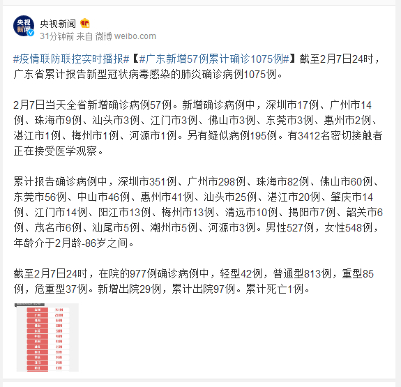 截至2月7日24时,广东省累计报告新型冠状病毒感染的肺炎确诊病例1075例。