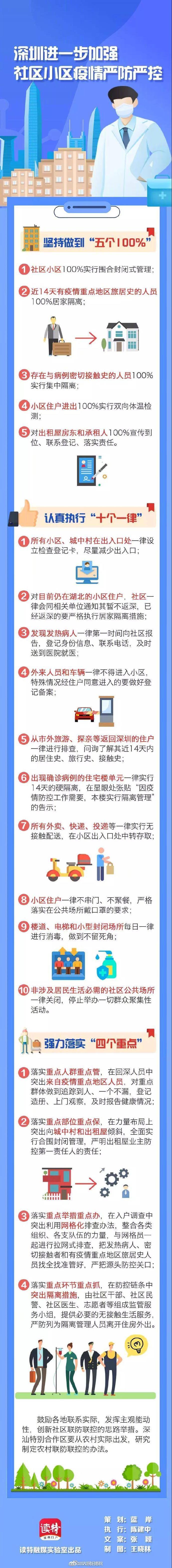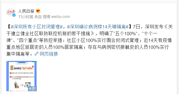7日,深圳发布《关于建立健全社区联防联控机制的若干措施》,明确了“五个100%”、“十个一律”、“四个重点”等防控举措:社区小区100%实行围合封闭式管理;近14天有疫情重点地区旅居史的人员100%居家隔离;存在与病例密切接触史的人员100%实行集中隔离等。