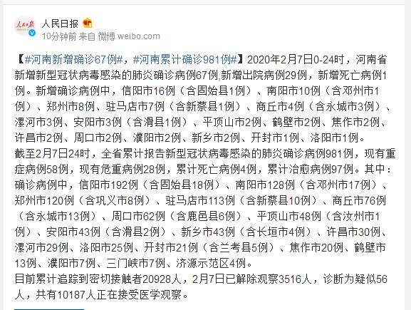 截至2月7日24时,全省累计报告新型冠状病毒感染的肺炎确诊病例981例,现有重症病例58例,现有危重病例28例,累计死亡病例4例,累计治愈病例97例。其中:确诊病例中,信阳市192例(含固始县18例)、南阳市128例(含邓州市17例)、郑州市120例(含巩义市8例)、驻马店市113例(含新蔡县10例)、商丘市76例(含永城市13例)、周口市62例(含鹿邑县6例)、平顶山市48例(含汝州市1例)、安阳市43例(含滑县2例)、新乡市43例(含长垣市4例)、许昌市30例、漯河市29例、洛阳市25例、开封市21例(含兰考县5例)、焦作市20例、鹤壁市13例、濮阳市7例、三门峡市7例、济源示范区4例。