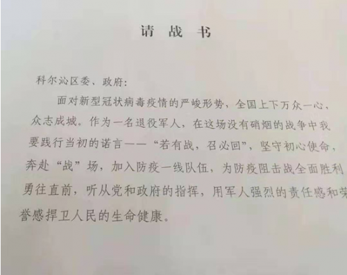 “若有战,召必回”说这句话的是一群退伍的军人。面对新型冠状病毒这场没有硝烟的战争,科尔沁区111名退役军人挺身而出,践行当初参军时许下的的铮铮誓言,不忘初心,坚守使命,为科尔沁区委政府递上了加入防控一线的请战书。