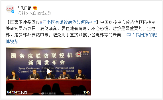 中国疾控中心传染病预防控制处研究员冯录召:病例隔离、居住地有消毒,不必恐慌。防护是最重要的,坐电梯,走步梯都要戴口罩,避免用手直接触摸小区电梯等的表面。