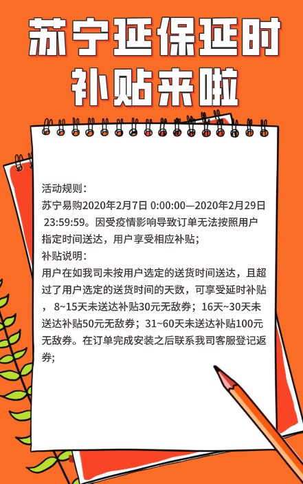 即日起至2月29日,如您购买指定苏宁自营送货(不含厂送)的家用电器商品,如空调全品类,电视,冰洗和部分厨卫品牌等,如果因疫情影响没有按您选定的送货时间送达,且超过了一定的天数,就可以享受到苏宁延保提供的延时补贴。8-15天未送达补贴30元无敌券;16天-30天未送达补贴50元无敌券;31-60天未送达补贴100元无敌券。每个账户在活动期间仅可参与1次政策补贴。有延迟送货情况的消费者在订单完成安装之后,就可以联系苏宁客服登记返券。