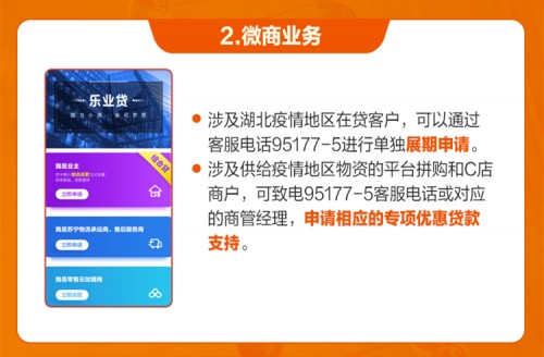 在微商业务方面,苏宁金融对受疫情影响较大的批发零售、住宿餐饮、物流运输、文化旅游等行业,以及有发展前景但受疫情影响暂遇困难的企业,特别是小微企业,将尽最大努力保证其贷款。尤其是涉及湖北疫情地区在贷客户,可以通过客服电话95177-5进行单独展期申请。而涉及供给疫情地区物资的平台拼购和C店商户,可致电95177-5客服电话或对应的商管经理,申请相应的专项优惠贷款支持。对于符合标准的商户,将给予商户近3个月月均销售金额的2倍的小额贷款授信额度(每个商户最高不超过10万元);如额度需求更高,可提供相关授信材料,申请审批部门单户单议处理。且贷款利息下调20%。活动有效期至02月17日17时,单笔用信期限3个月,按月付息到期还本,支持提前还款。