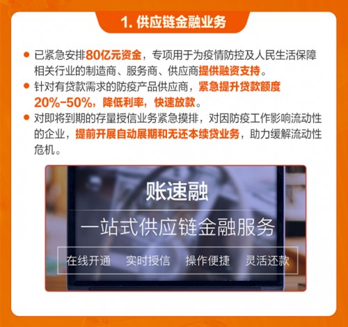 在供应链金融业务方面,苏宁金融已紧急安排80亿元资金,专项用于为医疗卫生、粮油食品、果蔬生鲜、大快消、物流运输等疫情防控及人民生活保障相关行业的制造商、服务商、供应商提供融资支持。尤其是针对有贷款需求的防疫产品供应商,紧急提升贷款额度20%-50%,降低利率,快速放款。对即将到期的存量授信业务紧急摸排,对因防疫工作影响流动性的企业,提前开展自动展期和无还本续贷业务,助力缓解流动性危机,渡过难关。