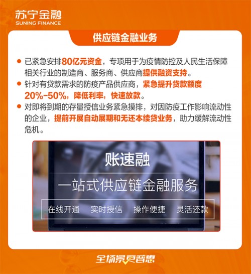 面对当前新型冠状病毒肺炎疫情防控的严峻形势,苏宁金融根据央行、银保监会等五部委联合发布的《关于进一步强化金融支持防控新型冠状病毒感染肺炎疫情的通知》要求,积极运用金融科技力量,开辟融资服务绿色通道,提升服务效率,为打赢这场战“疫”提供更加精良的“装备”、更加充足的“弹药”,已为蓝月亮等与疫情防控相关的多家企业紧急放款,发放供应链融资超千万元,全面助力疫情防控。