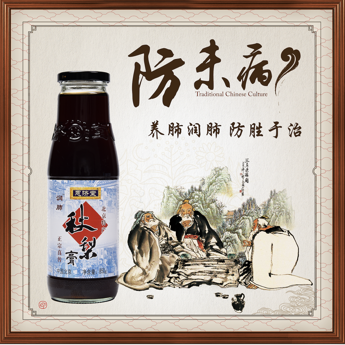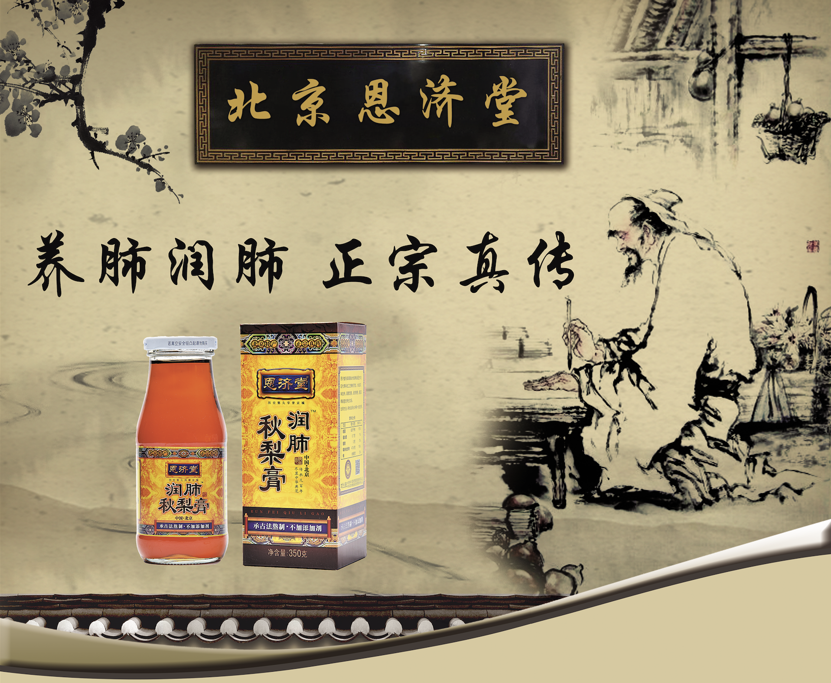 正宗传统的恩济堂秋梨膏之所以久负盛名,不止是因为其康熙帝宫廷秘方的名头,更是因为其优质选材和经典工艺造就出的好味道、好营养。恩济堂秋梨膏选用鸭梨、雪花梨为主料,配以止咳、生津、润肺的枇杷、甘草、蜂蜜等各类滋补原料,放入特制铜锅中熬煮而成,铜锅内壁镀有一层锡,熬制过程中为熬制的梨汁不断加入冰糖、蜂蜜和生姜,九滤九榨,反复过滤残渣,压榨梨浆,加入锅中,周而复始,九九归一,再根据不同配方加入茯苓、胖大海、金银花、人参、燕窝等辅料,历经数道工艺最终熬制成浓稠梨膏。一勺秋梨膏、一杯温水,作为老北京人干燥季节有效缓解上火、嗓子疼痛、咳嗽等症状的养生佳品,恩济堂秋梨膏润肺养肺的效果无人不知。如今面对当下季节已发生的流感病毒、新冠病毒等,防胜于治,没事多喝恩济堂秋梨膏润肺润肺再润肺,加强锻炼提高身体素质才是能够有效抵抗病菌的最佳屏障。
