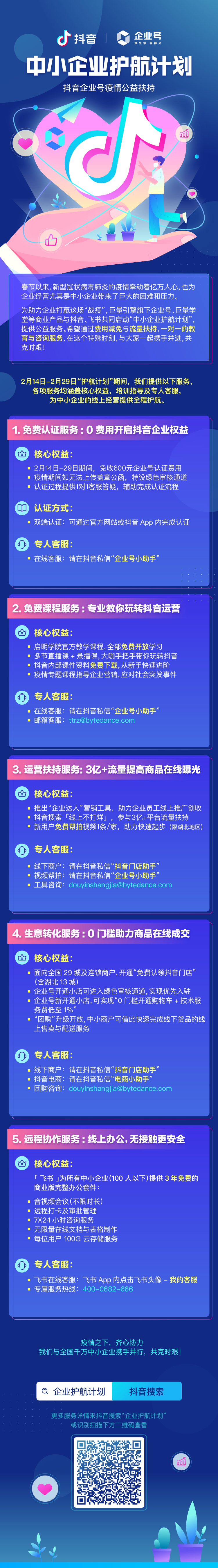 春节以来,新型冠状病毒肺炎的疫情牵动着亿万人心。为助力社会各界共同打赢这场“战疫”,巨量引擎与抖音、飞书共同启动“中小企业护航计划”(以下简称“护航计划”),通过提供免费认证、免费课程、运营扶持、生意转化、远程协作等系列服务,帮助中小企业快速获取线上经营的能力,恢复正常运转,在特殊时期共度难关,打造长期增长引擎。
